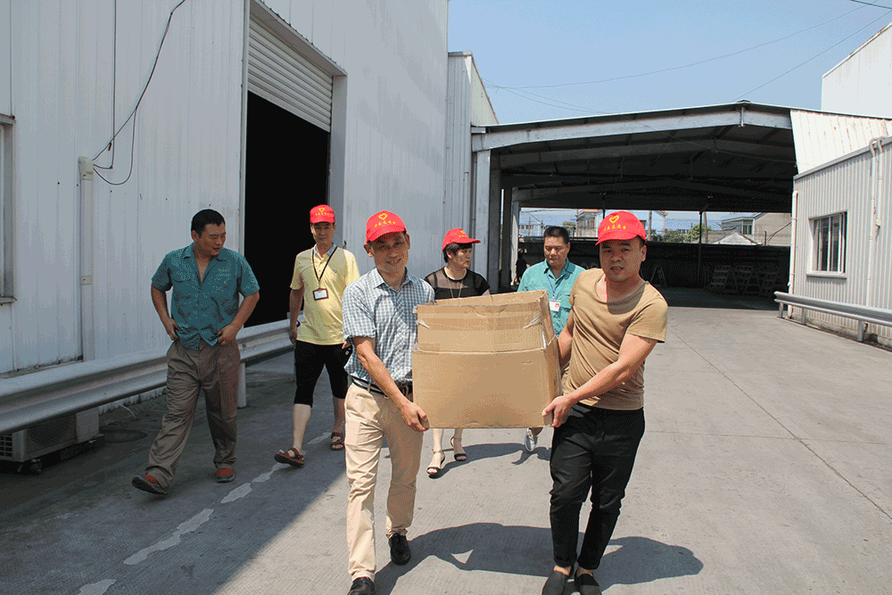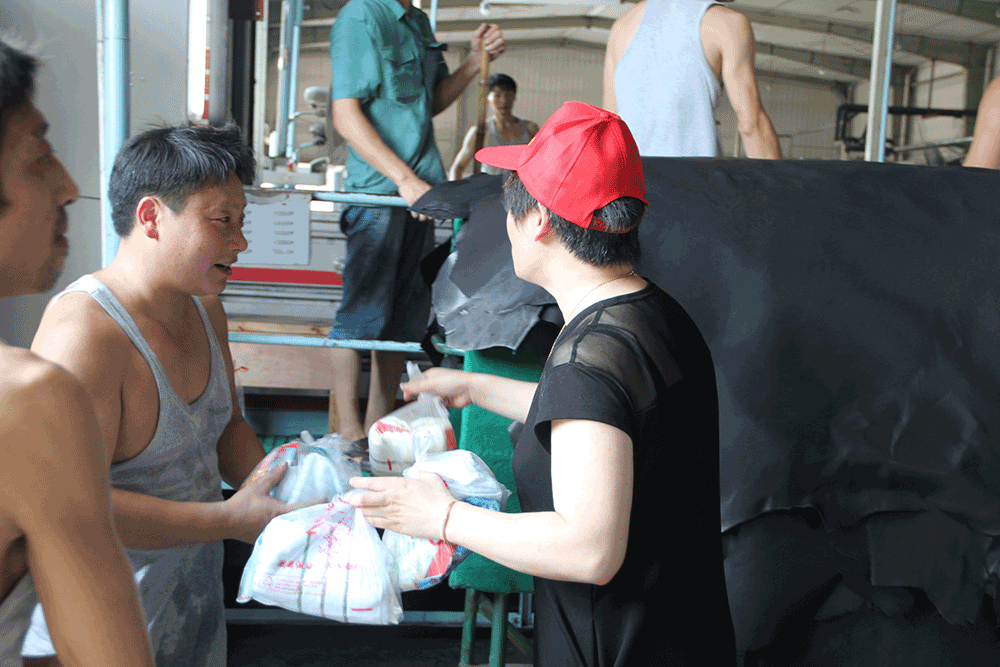 上午10時許,志愿者們兵分三路,帶著豆奶、毛巾、洗衣粉等用品,前往森德公司、海寧卡森公司和家值公司的繃板車間和真空車間,為一線忙碌的工人們送上了清涼用品,與他們親切握手,對高溫天氣中依然堅守崗位的一線員工表示感謝,感謝他們不辭炎熱和勞累,為公司生產(chǎn)積極奉獻(xiàn)。同時關(guān)切地要求他們注意身體健康和勞動安全,做好防暑降溫工作。