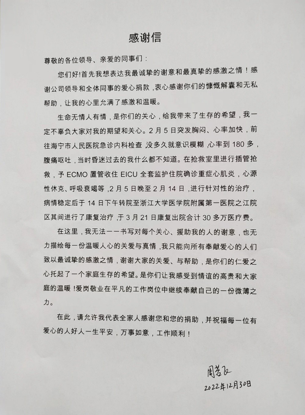 今年年初,周若飛突發(fā)重癥心肌炎,經(jīng)過(guò)一個(gè)多月的搶救和手術(shù)治療,最終挺過(guò)難關(guān),但花費(fèi)了一筆很大的醫(yī)療費(fèi)用,自費(fèi)費(fèi)用近20萬(wàn)元,給家庭造成了較大的經(jīng)濟(jì)壓力。為此,集團(tuán)員工關(guān)愛(ài)互助基金解員工之憂,按基金會(huì)章程規(guī)定,給予了周若飛頂級(jí)的醫(yī)療救助金。