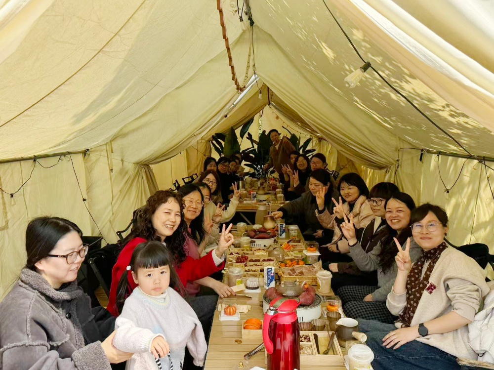 種完多肉,大伙兒圍爐煮茶。人手一份小點心,雪梨木耳湯。果盤里還有冰糖小葫蘆、堅果、水果等,爐上有茶和烤紅薯。放下繁忙的工作與生活,圍在一起聊聊天,談談心,舉杯共飲,享受這一刻最真實的悠閑與快樂。